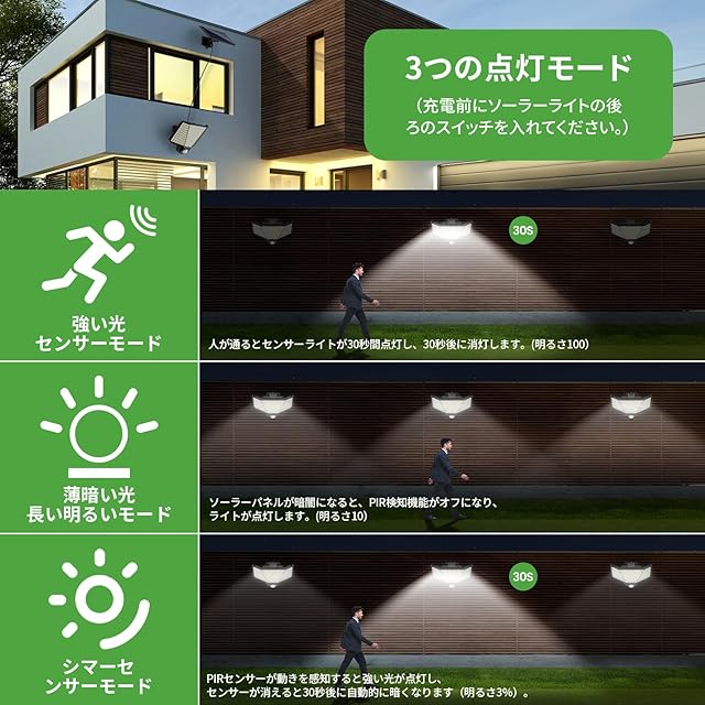 【3つの点灯モードとリモコン】の人感センサー付きソーラーライトは、リモコンまたはソーラーライト背面のボタンで3つの点灯モードを簡単に切り替えることができます。屋外用ソーラーライトは、強い光センサーモード、薄暗い光ロングブライトモード、シマーセンサーモードから選択し、毎日の照明ニーズに応えます。