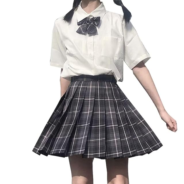 [Vasarhely] 制服 スカートプリーツスカート チェック柄 リボン付き スクールスカートコスプレ 女子高生 JK 高校生 ショートス 可愛い 大きいサイズ 制服 学園祭 文化祭 遊園地(XL 3点セット(グレー42cm))