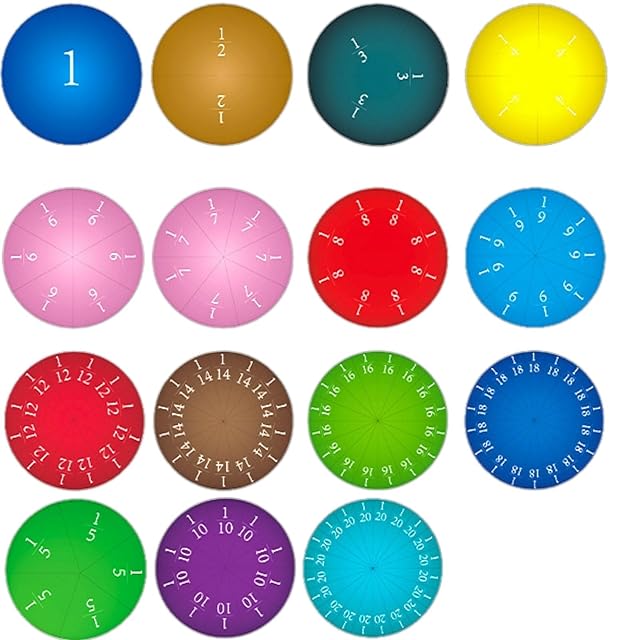 ✅「1」、「2分の1」、「3分の1」、「4分の1」、「5分の1」、「6分の1」、「7分の1」、「8分の1」、「9分の1」「10分の1」、「12分の1」、「14分の1」、「16分の1」、「18分の1」、「20分の1」を作成でき、135個のパーツになっています。