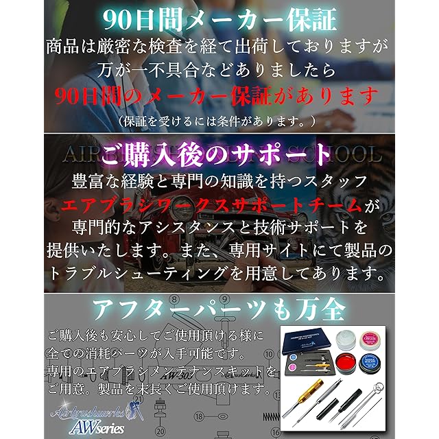【アフターも安心】90日間のメーカーを提供します。消耗部品などのアフターパーツの提供やメンテナンスキットをご用意しており、製品を長くお使いいただけます。さらに、エアブラシワークスサポートチームが、製品の使い方のアドバイスやトラブルシューティング、メンテナンスと修理に関するサポートを提供します。お客様がエアブラシを快適に使用できるよう、専門のサポートチームが全力でサポートいたします。【全製品吹付けテストを実施】エアブラシワークスAWシリーズでは品質安定化の為に、エアブラシ職人による吹き付けテストを全製品実施しており、複数ノズルの交換テストなどを経てエアブラシ本来の性能を引き出した状態に調整してあります。
