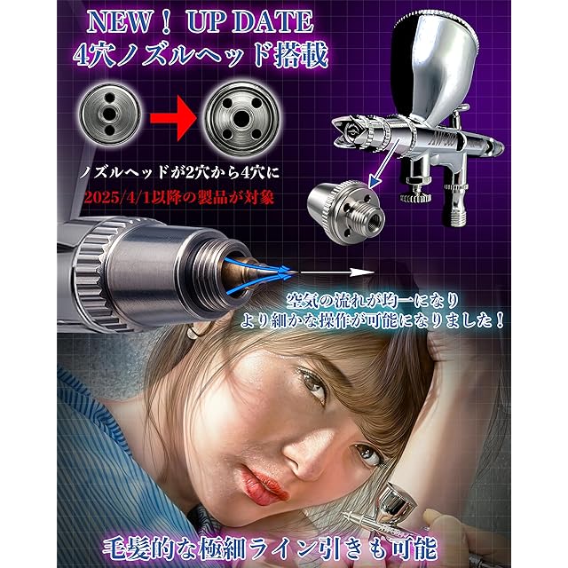 【改良版4穴ノズルヘッド搭載】2025/4/1以降の製品には、従来の2穴構造から4穴構造へと進化したノズルヘッドを搭載しました。エアーの流れがより均一かつ安定し、ニードル先端にエアーが集中することで、より繊細でコントロール性の高い描写が可能になりました。細いラインやディテール表現を求める方に最適な改良モデルです。