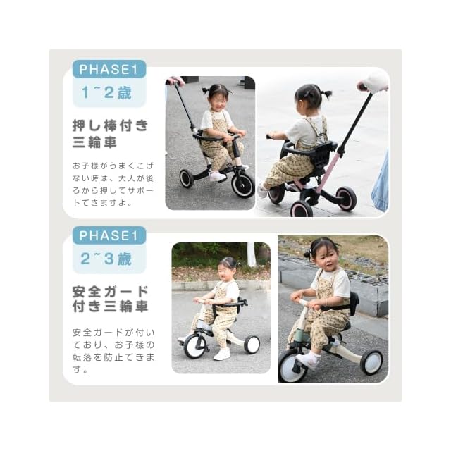 【一台4役】手押し三輪車モード、三輪車モード、ランニングバイクモード、自転車モード。様々な使い方があり、工具なしで組み合わせできです。お子様の成長に合わせて6階段でご使用いただけます。