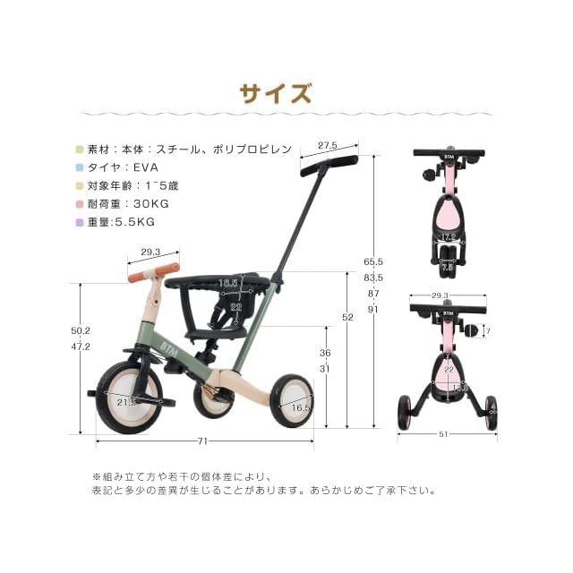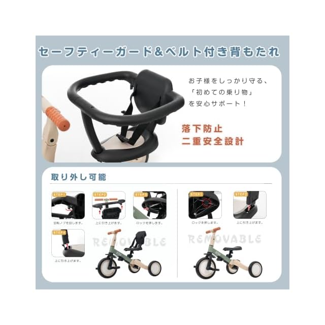 【安全性が高い!】①こどもがハンドルを急旋回させ、曲がりすぎることを防ぐため回転角度を制限し、より安全性を高めました。②赤ちゃんの安全をより効果的な保護できます。 お子様の体型に合わせて、高さ25cm調整できるサドルとハンドルは4段階を調整できます。③三輪車の後部に付いているコントロールバーには進む方向を操作できる舵切り機能付き!