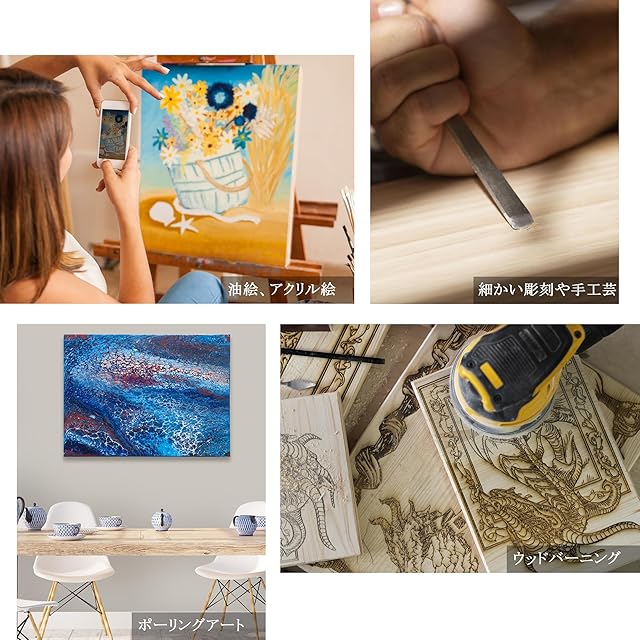 幅広い用途 - 滑らかでしっかりとしたペイント面は、油絵、アクリル、水彩、テンペラ、エンカウスティック、注ぎ絵の具など、あらゆる媒体を受け入れます。また、コラージュ、デコパージュ、インパスト、ドライマウントプリント、ウッドバーニングなどの細かい彫刻や手工芸にも使用できます。特に絵画や工芸が好きな初心者に適しています。