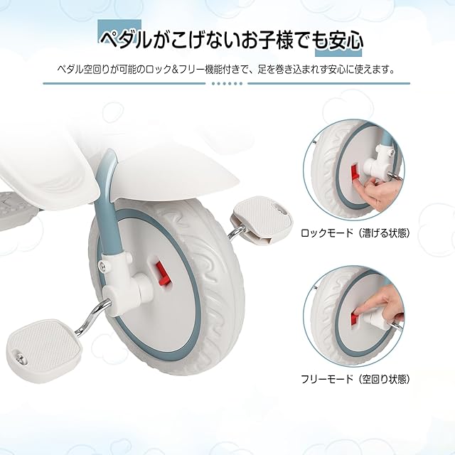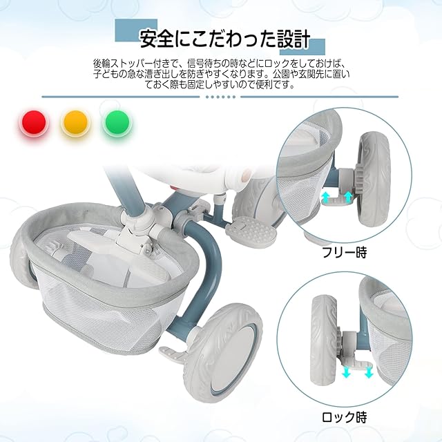 【安全にこだわった設計】シートベルトと安全カード付き、不意に身を乗り出したり、三輪車の揺れでずり落ちてしまうのを防ぎます。誤発進を防げるストッパー付きで、信号待ちや坂道に停車する際など、ペダルを漕いでも動かないよう固定したいときに便利です。