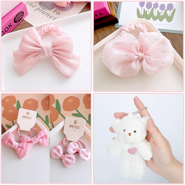 【かわいいヘアアクセサリーセット】エレガントな韓国式パールストーンヘアピン、ピンクの可愛いリボンヘアピンとシュシュ、日常用のヘアゴムセットと可愛いモコモコの白いクマちゃん。豊かなデザインや色で気分やお洋服に合わせて選ぶのも楽しいです。