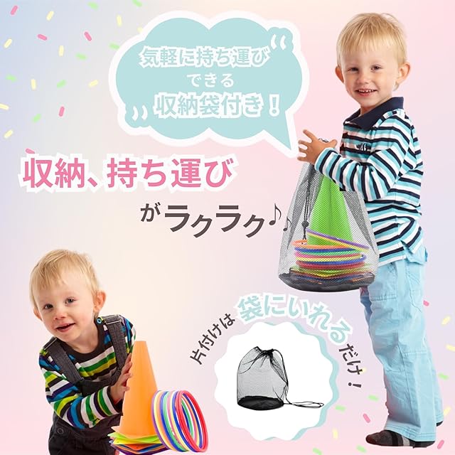✅✅✅✅✅セット内容 カラフルなコーン6個と輪がたくさん入った本格的なセット!目を引くデザインでゲーム性が高く、初心者から上級者まで楽しめます。収納袋付きで、使い終わった後もスッキリ収納可能。コーンや輪投げの色はランダムですが、色の偏りが少なくなるようにしております。 16個セット…カラーコーン6色6個セット 輪投げ10個 収納袋1枚 32個セット…カラーコーン6色12個セット 輪投げ20個 収納袋1枚