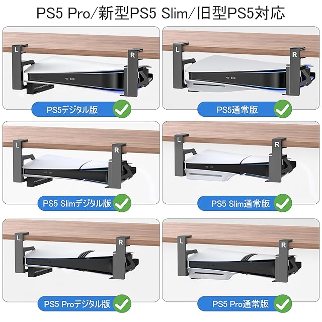 【PS5 Pro/PS5 Slim/PS5対応】PS5デスク下ホルダー PS5横置きスタンド デスク下 収納 穴あけ不要 プレステ5 マウント PS5周辺機器 省スペース 放熱改善 転倒防止 新型PS5スタンド PS5/PS5 スリム 通常版とデジタル版両対応