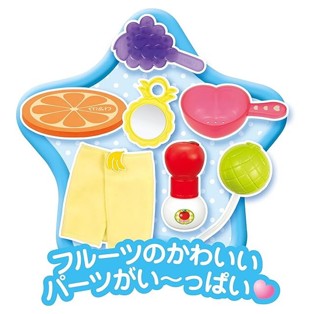 ・おふろ時間に、驚きと楽しさを感じられるメルちゃんだよ! ・対象年齢:3才以上 ・セット内容:メルちゃん(フルーツのワンピース、パンツ付き)、いちごのおふろ本体、パイナップルのかがみ、ぶどうのブラシ、りんごのシャンプー、もものておけ、メロンのポンプ、オレンジのバスマット、バナナのタオル、シールシート、はじめてブック
