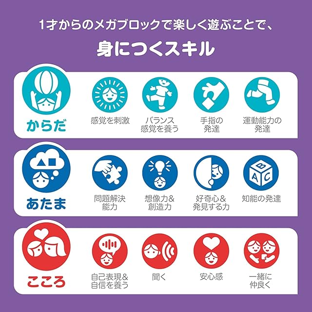【内容】1~3才のお子さま向けに特化して開発された、メガサイズのブロックたっぷり150個セット、特殊パーツ入り。適度な固さの特別に大きなサイズのブロックは、小さなお子さまでも重ねたり、はずしやすい設計。ストレスなく夢中になって遊べます。さらに、葉っぱや、動物の目、タイヤといった特殊パーツは、お子さまの想像力を刺激し、自由な発想を育てます。パッケージは、大容量の繰り返し使えるチャック付きのバッグで、持ち運びもお片付けもラクラクです。2023 MEGA Brands.