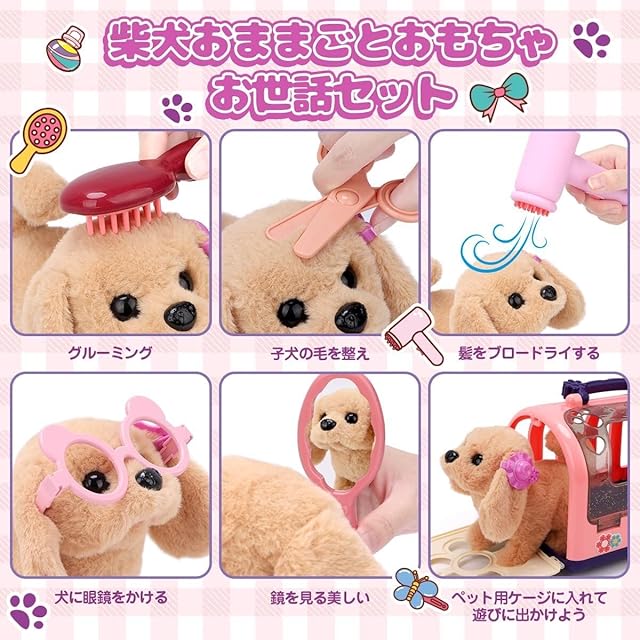 商品名:REMOKING ぬいぐるみ ロボット犬 電子おもちゃ おままごと 電動式 音声付き ごっこ遊び 柴犬 多機能 知育玩具 ロールプレイ しゃべる ぬいぐるみ 子供用玩具 女の子 男の子 小学生 クリスマス 誕生日 プレゼント ギフト お祝い 14点セット ペットケアセット