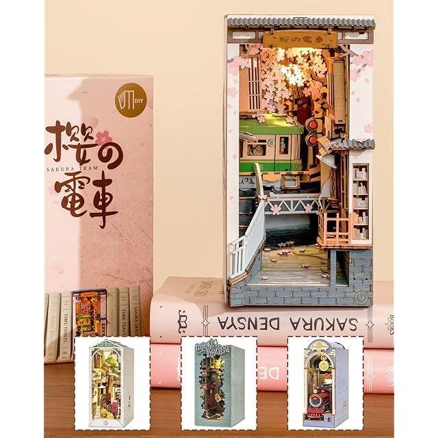 ROBOTIME ブックヌック キット 立体パズルで作る「桜の電車」- 桜咲く駅の世界を再現!LED内蔵 3Dウッドパズル ブックヌックシリーズ 本立て ブックエンド機能付き 大人も子供も楽しめる木製ミニチュア キット 和風 インテリア雑貨 手作り DIY クラフト 誕生日 記念日プレゼントに最適
