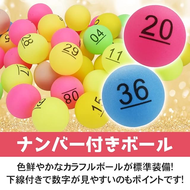 1-100番まで割り振られたナンバーボールが付属します。大勢の人が参加可能なため、宴会やパーティーなどの大規模なイベントにも活躍します。