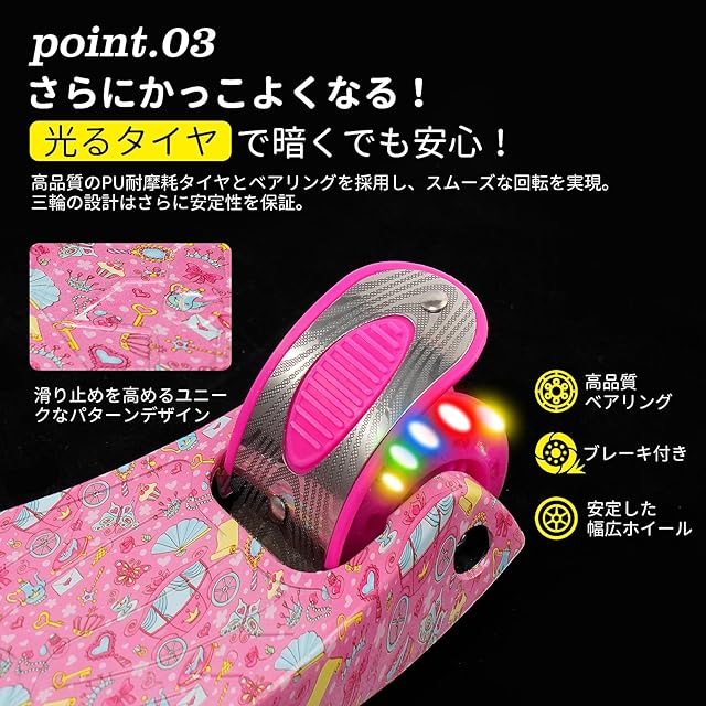 【LED点滅ホイール&滑り止めデッキ】 両輪には、電池不要の発光LEDホイールが付いています。お子さまがスクーターに乗ったら、ホイールを回すだけで、カラフルに光ります。クールな外観はお子様を喜ばせるだけでなく、夕暮れ時や夜間でも目立つため、安全を守ります。滑り止め付きペダルも搭載されています