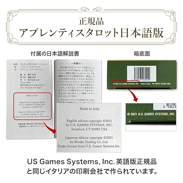 ✅【US Games Systems, Inc.認定 】US Games Systems, Inc.のアプレンティスタロット英語版と同じイタリアの工場で印刷されているため、英語版とカードの品質・絵柄等は全く同じです。