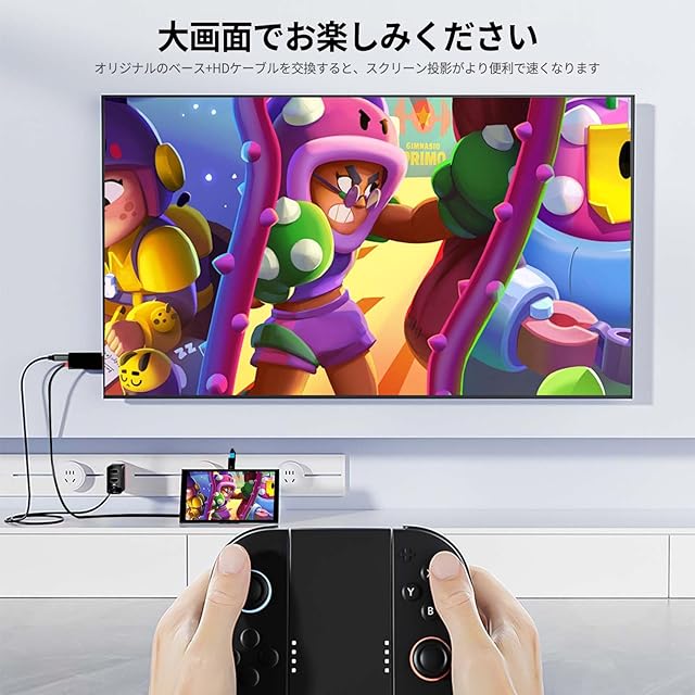【使用手順】Step 1:ドックとテレビをHDMIケーブルと充電器接続します。 Step 2:TVの電源を入れ、スイッチがオンになっていて画面がオンになっていることを確認します。スイッチをドックに置きます。 Step 3:約2〜5秒待つと、インターフェイスがテレビに自動的に表示されます。