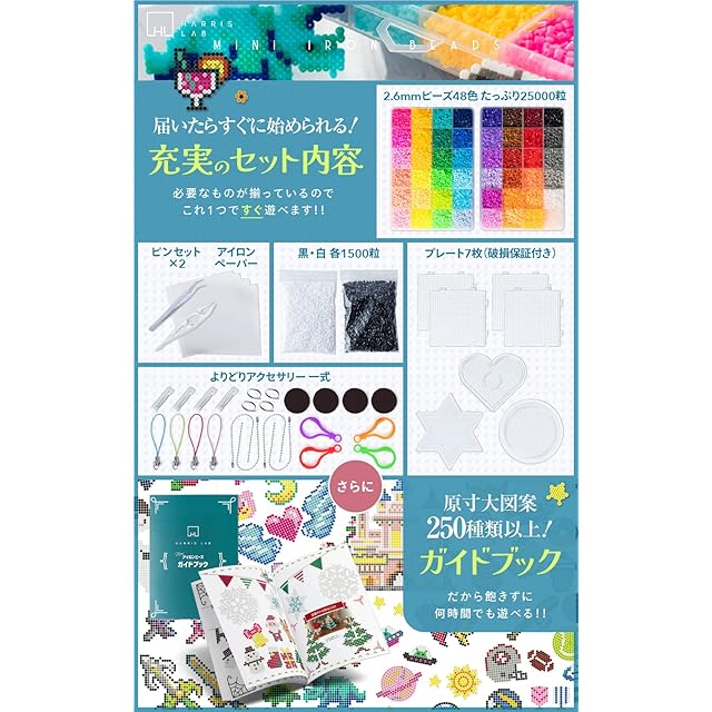 [ハリスラボ] アイロンビーズ セット 2.6mm ミニ 『デラックスセット』 48色 図案250種類 25000粒 白 黒 各+1500粒 ミニアイロンビーズ アイロン シート プレート ピンセット
