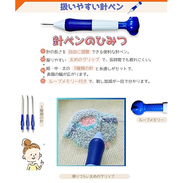 【はじめてでも出来る動画付き説明書】初めてでも安心のフルカラー全8ページのガイドブック付属。パンチニードルの基礎知識、画像付き8つの工程で作り方を解説。また、針ペンの使い方からパンチニードル刺繍の基本ステッチ、失敗防止のハウツー等、段階的に学べるステップアップ動画付き。