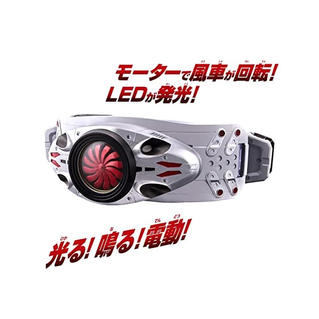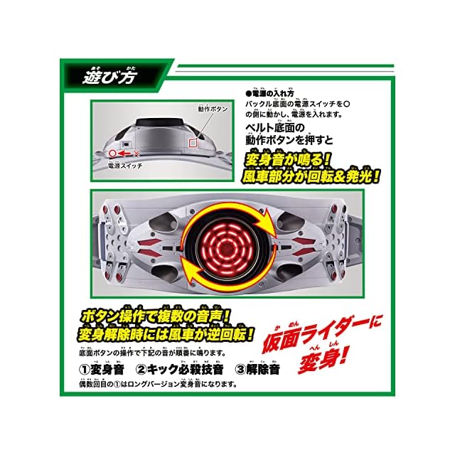 ベルトのボタンを押すとモーターで風車が回転!変身音が鳴りLEDが発光します。変身音の他、ボタン操作でキック必殺技音、解除音も楽しめます。