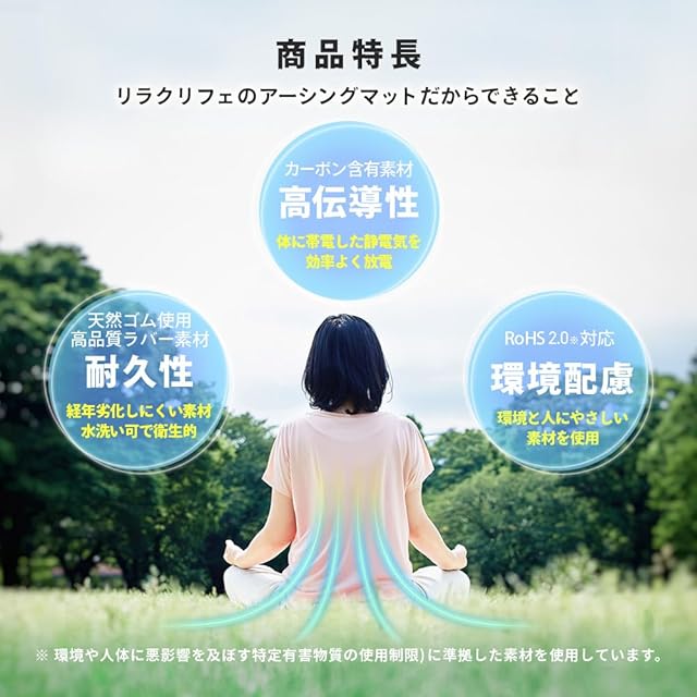 【商品概要】 リラクリフェのオリジナルアーシングマット(ラバータイプ)は、ラバー素材の高品質なマットです。このマットは大地との接続を通じてアーシングを可能にし、電気的なバランスを整えることを目的としています。
