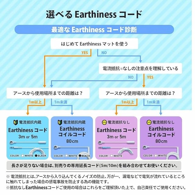 ※大地と繋がるアーシングはコードを使用して、アースに接続することでアーシングができます。コード不要(無線)で、大地と繋がるアーシングはできませんのでご注意ください。 コードを使用しない場合では、除電(空中に放電)をすることは可能です。除電(空中に放電)とは、電気は電気の流れやすいところに集まる特性があります。電気は一定量以上溜めておくことができないのでそれ以上集まることで放電(空中に放電)をしてくれる仕組みです。