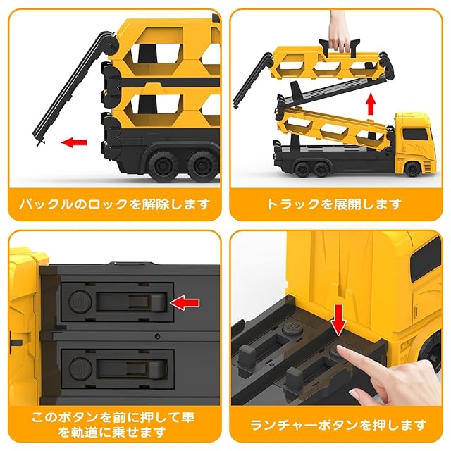 【折りたたみ部分】:輸送トラックのおもちゃには折りたたみ可能なトラックがあり、広げたり折りたたんだりして遊ぶことができ、2つの形状でさまざまな遊び方を提供します。トラックがコースに変更して、競争することができます。レールを伸ばすとレース会場に、たちまち早変わりしました。 ボタンを押して、車を左右に1台ずつセットしまして、よーいスタート!勢いよく飛び出すのでレースは一瞬で終わりますが、 子供たちが楽しそうに遊んでいます♪