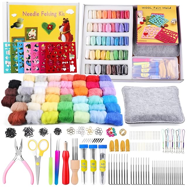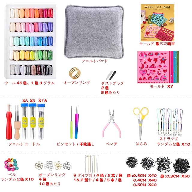 豊富な375点羊毛フェルト セット: 45*フェルト羊毛、20 x 9-ニードル(4色,5本/色)、20* T-ニードル(4色,5本/色)、1*はさみ、1*スクレーパー、2*ぼろきれ、1*フェルティングマット、7 *ウールフェルトモールド、1*シンブル、10*鈴、5*ブラックダストプラグ、5*ホワイトダストプラグ、2*指サック、1*ピンセット、1*千枚通し、1*木製フェルトハンドル、1*ペンチ、3*ニードルボトル、32*フェルトニードル(3 サイズ,S/16本、L/8本、M/8本)、1*木製のフェルトハンドル8針、40*リング、50*鼻、120*目、10*ストラップ。合計375点 フェルト キット。