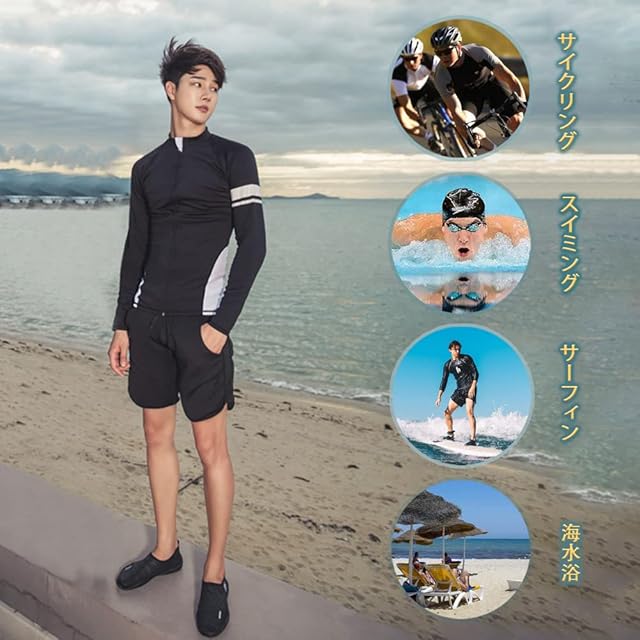 【素材構成&吸汗速乾】85%ポリエステル、15%スパンデックス。伸縮性と通気性に優れており丈夫で破れにくい素材を採用。軽量なのでとても動きやすく、最適の機能性、吸汗速乾通気のドライ繊維、激しい運動の後もさらっとした着心地!肌触りの良い素材を使用しているので、着心地は抜群。伸縮性に優れており、体形に合わせやすく、水中での動きも妨げないように体にフィットします。速乾性にも優れ、水に濡れてもすぐ乾きます、で運動も快適に行えます。前開き対応のラッシュガードは着脱も簡単です、着替えに便利。
