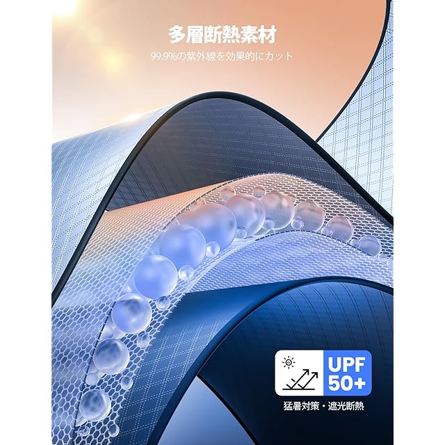 【高品質6層構造・遮光断熱】夏には、紫外線を防ぎ、車内の温度を下げることを目指します。フロントサンシェードにより、紫外線に対するバリアを作ります。約98%以上の紫外線を効果的に遮断しますので、外気温が上昇しても、駐車中の車内を涼しく保ち、ひどい暑さを防げます。蒸し暑い車の環境に悩まされることはなくなります。