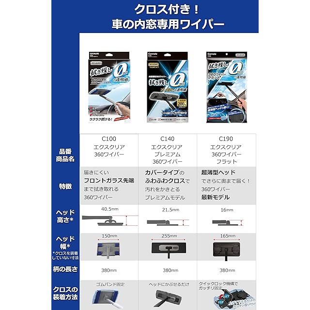 車のフロントガラス(内側)を楽な姿勢でどんどん拭くことができるワイパー「 エクスクリアプレミアム 360ワイパー(C140)」の交換用クロスです。