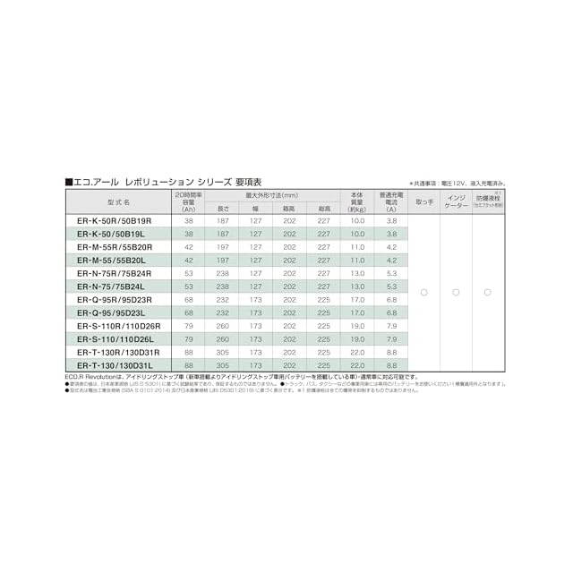 ECO.R Revolution(ER)は、アイドリングストップ車(新車搭載よりアイドリングストップ車用バッテリーを搭載している車)・通常車に対応可能です(60B19タイプを除く)。トラック、バス、タクシー、業務用車などには専用のバッテリーをお使いください(補償適用外となります)。