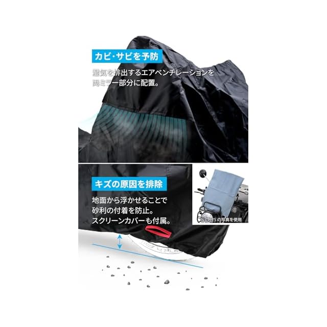 【仕様4】中央のベルトと後部の絞りひもでバタつき防止、前後大型チェーンロック対応ホール装備、ミラー部湿気防止ダクト装備、スクリーンすり傷防止カバーと収納袋を付属