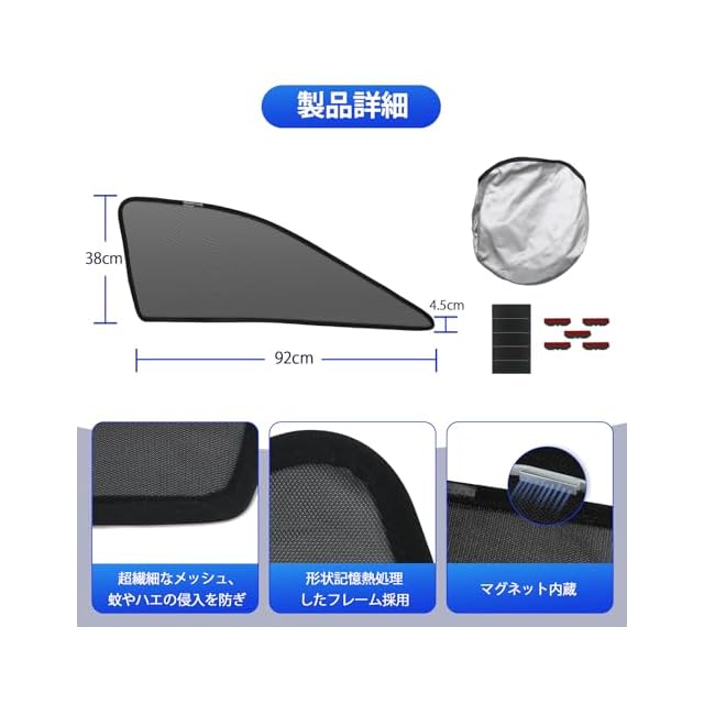 【適用車種】スズキ 新型 スペーシア・スペーシアカスタム 型式:MK54S MK94S。年式:2023年11月-現行。※年式・グレード・オプション等により適合しない場合が御座います。車種や形状をご確認いただいた上、お買い求めください。※折りたたんだ状態でのとなります。多少のシワがあります。予めご了承ください。ご注意:取付位置に関して、商品の下部分をガラスの隙間に挿すことではなく、窓枠の上に置いてください。窓枠によりの設計サイズなので、ガラスに挿しましたら小さくか大きくなります。なお、車種構造によって、一部の車種のはマグネット式でも付属品の使用が必要になります、予めご了承ください。