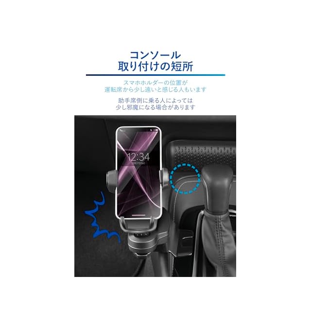 ●センターコンソール取り付けのココがイイ! 〇運転中の視界の邪魔になりません。 〇エアコンの風を邪魔せず、いつでも快適にエアコンの風を受けることが可能です。 〇エアコンの風が直接当たらないため、スマートフォン内に結露が発生する心配がありません。