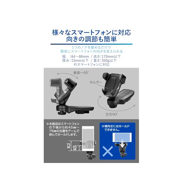 ●様々なサイズのスマートフォンをホールド可能 【幅:64~86mm/高さ:170mm以下/厚み:15mm以下/重さ:350g以下】のスマートフォンに対応します。ケースを付けていても、ホールド可能なサイズ内であればホールドできます。※スマートフォンを横向きしてホールドはできません。