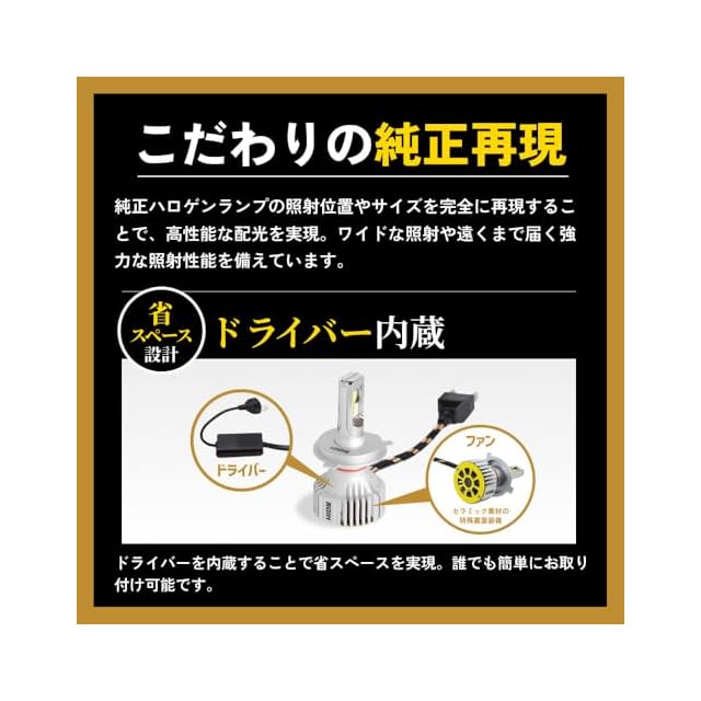 【ドライバー内蔵で簡単取り付け】 ドライバーを内蔵した省スペース設計により、複雑な配線を必要とせず簡単に取り付け可能。多くの車種で手軽に交換できるため、初めての方にも安心です。さらに特注モーターを用いた冷却ファンは静音性に優れ、装着後すぐに快適で明るい走行環境を体感できます。