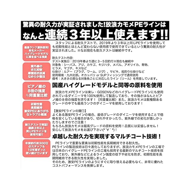 【連続3年以上使える】実証された放浪カモメPEラインの耐久力!スタッフによる耐久テストで、2019年より3年以上同じPEラインを使用しても初期性能とほとんど変わらない使用感で使用できているという驚異の耐久性が実証されました。※なお現在も耐久テストは継続中です。