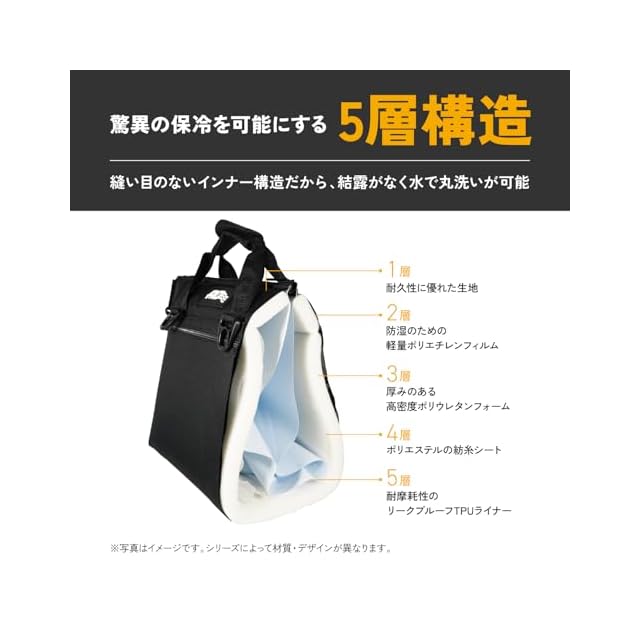 ■素材はウォーターベッドや地面に設置するポールなどにも使われている素材と同じ高品質なビニールライナーを採用。■内部の断熱材は厚み1.9cm、高密度の独立気泡フォームを使用しています。この素材の組み合わせにより、サイズによっては氷なら外気温49℃の中で約24時間維持できる程、驚異の保冷力を発揮します。■縫い目のないシームレス構造。高品質溶接TPUライナーでインナーからの水漏れを防ぎます。冷気が逃げず保冷力を高めます。