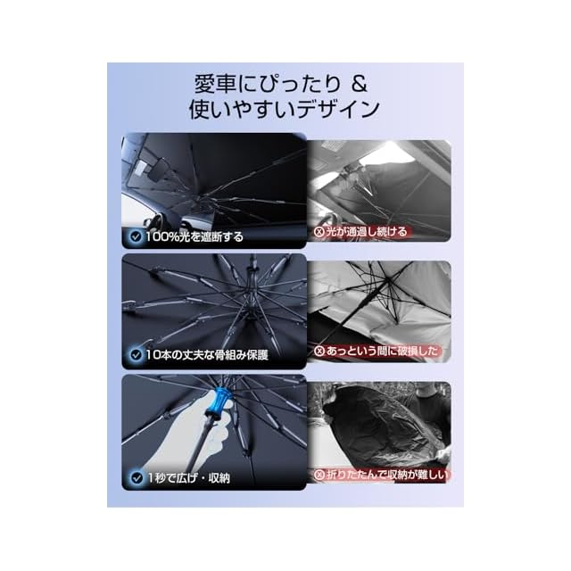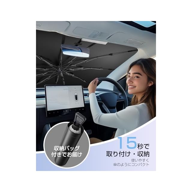 【取り付け・収納簡単】わずか1秒で広げて閉じることができます。中棒のボタンを押すだけで簡単に傘を広げ、その後すぐに収納可能。開閉時間は15秒以内で、使用後は付属の収納袋に入れて車内のどこにでも収納できます。従来のサンシェードとは違い、折りたたむ手間は一切必要ありません。