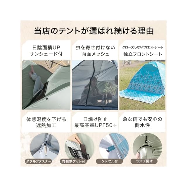 【スタッフのおすすめポイント!】 ・日差しを和らげ、アウトドアをより快適に ・簡単に設置が出来るポップアップ式 ・虫の多い季節も安心の両面メッシュ ・広々使える幅200cm ・急な雨にも対応!耐水圧1200mm ・脚を伸ばしてくつろげるフロントシート付き ・UV95%以上カット!シルバーコーティング ・フルクローズできて透けないから着替えや授乳も ・小物が入れられるメッシュポケット ・テント内にはランタンをかけられるフック付き ・背負える&肩掛けもOK!便利な2WAYケースにリニューアル・気軽に持ち運べる軽量2.5kg