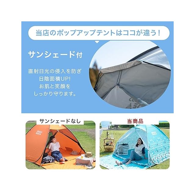 【スタッフのおすすめポイント!】・日差しを和らげ、アウトドアをより快適に ・簡単に設置が出来るポップアップ式 ・虫の多い季節も安心の両面メッシュ ・広々使える幅250cm ・急な雨にも対応!耐水圧1200mm以上 ・脚を伸ばしてくつろげるフロントシート付き ・UV95%以上カット!シルバーコーティング ・フルクローズできて透けないから着替えや授乳も ・小物が入れられるメッシュポケット ・テント内にはランタンをかけられるフック付き ・便利な専用収納ケース ・気軽に持ち運べる軽量2.8kg