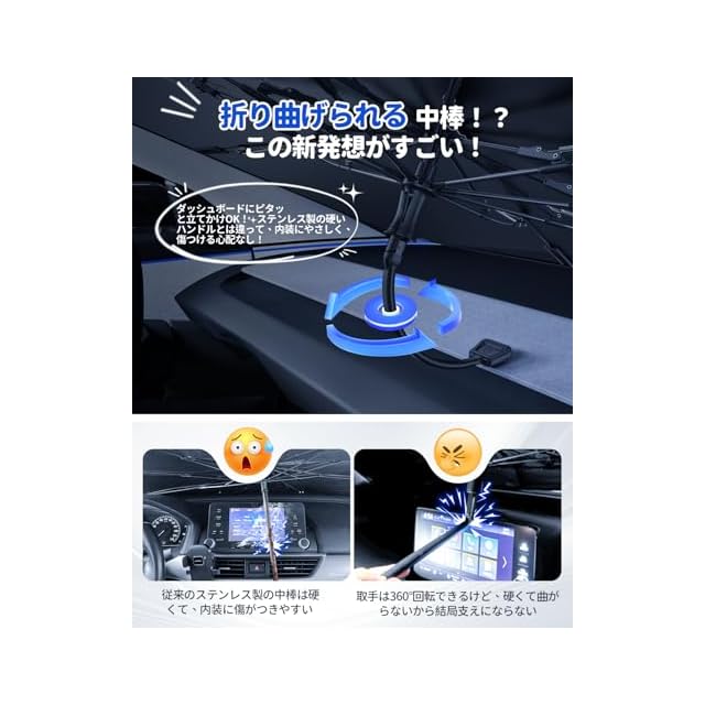 【干渉ゼロ。傷ゼロ。設置がスマートに進化】「車用傘型サンシェード=内装を傷つけるもの?そんな常識を覆す」TPE素材の傘柄が柔らかくしなり、自由自在にフィット。フロントガラスに当たらず、運転席を圧迫しない。さらに、ハンドルにはシリコンカバー付きで、センターコンソールとの擦れ・摩耗をシャットアウト。毎日開けても、閉じても、キズ一つ残さない。このやさしさ、クセになる。