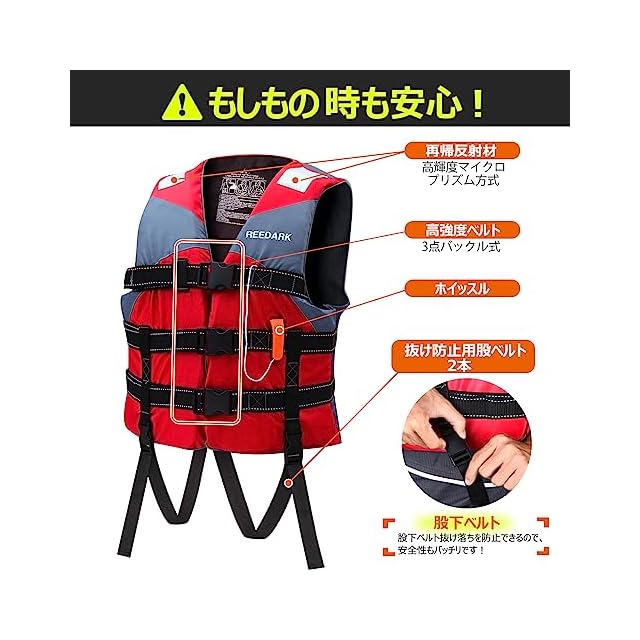 【機能性と安全性のこだわり】 最大90kgの引張力に耐えるバックルは、衝撃に強く壊れにくい設計であり、水中で使用時に脱げる心配はありません。3つの調節可能なストラップは使用者の体型に合わせて確実なフィット感と安定性を提供し、股下ベルトは万が一落水時ライフジャケットが浮き上がるのを防ぎます。さらに、両肩の反射板は夜間でも目立つ素材で、右胸部のホイッスルは迷子になっても「ここにいます!」と用着者の位置をお知らせます。