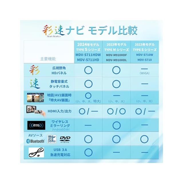 さらにきれいに、快適に進化した彩速ナビ、業界唯一、大画面8V型、HDパネル搭載フローティングモデル 緻密で立体的かつ滑らかな高精細HD映像を、ワイドな視野角で体感可能。グレア処理をした静電容量式タッチパネルを採用。フリックやピンチイン/ピンチアウト、ドラッグなどによるスムーズな 操作が可能です。 新ユーザーインターフェース 「オーガニックGUI PLUS」の搭載により、地図画面上に、ナビ情報(Info画面)とAV画面を同時に表示する2画面表示において、最大5.7インチの特大AV画面の表示が可能。 ハンドルから手を離さずに、発話してナビの操作ができる「音声操作」の起動を、音声で行うかボタン操作で行うかを設定できる「ボイストリガーのオン/オフ設定」を搭載。 対応USBケーブルの最大供給電流がDC 5V、3Aにアップし、タブレットの急速充電も可能になりました。また、USBデバイスに収録した音楽や動画を再生できるさまざまなメディアや音楽・動画ファイルも使用できます。 長野生産の日本製です。