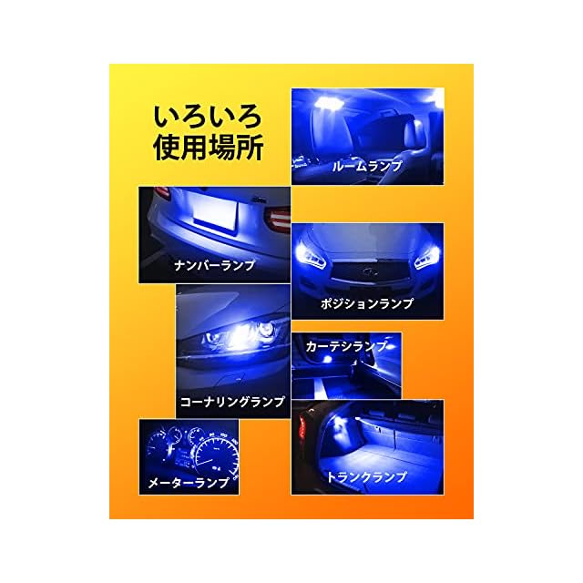 【多用途 LEDバルブ】:ルームランプ、ナンバー灯、メーターランプ、ライセンスランプ、コーナリングランプ 、クリアランスランプ、ポジションランプ、ドアライト等幅広く対応しています。ルームランプのみ車検対応、ほかの位置は当地基準によって違います。ブルー色は基準許可する場合、車検対応致します。無極性タイプなので差し込み方向を気にせずご使用可能。
