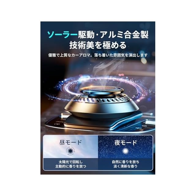 CEENIU 車用芳香剤 高級カー用品 2025新型 アルミ合金製 ソーラー回転式 静音 フランス産天然香料 エッセンシャルオイル2本付き F21 カーフレグランス Car Freshener
