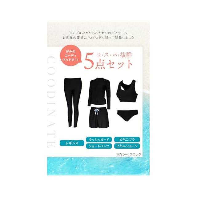 [AQXIA] ラッシュガード レディース 5点セット (プロウェイクボーダー推薦) 水着 体型カバー レギンス タンキニ ブラック M