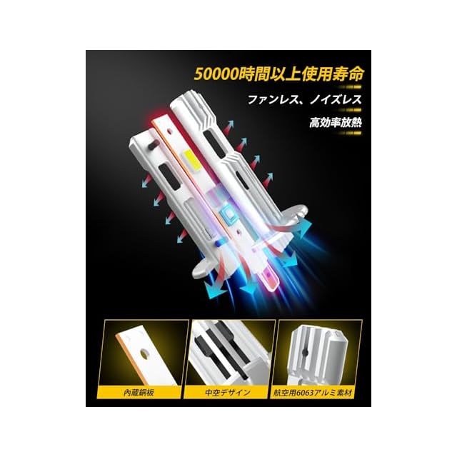 【優れた放熱設計&長寿命】h1 ledライトの本体は高熱伝導性6063航空アルミニウム合金素材の採用します。多重放熱構造のため、最大限度放熱面積を増やして、密閉空間の急速冷却が可能です。同時に、バルブ本体に定電流保護回路を内蔵し、電球の寿命を延ばすことができます。50000時間以上の長寿命実現します!独特のファンレス設計、騒音などは一切ありません。ファンの回転による騒音の悩みから完全に抜け出します。