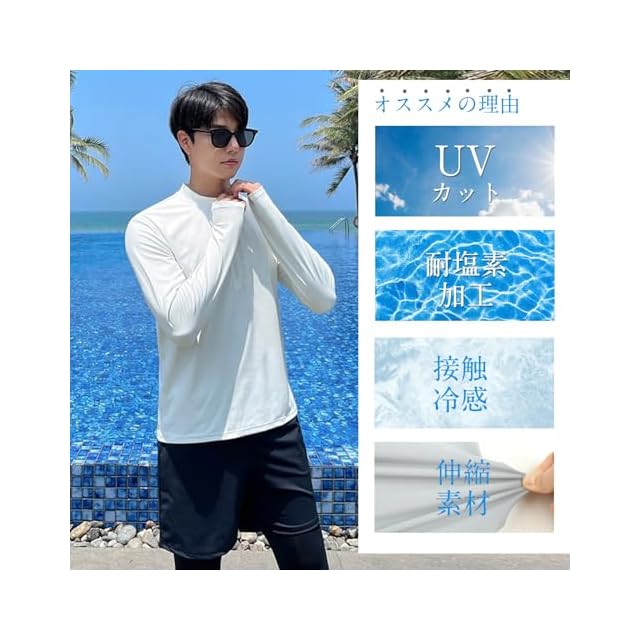 ラッシュガード&サーフパンツ&レギンス3点セット <br> ラッシュガード: 運動性を重視した設計で体型を気にせず着れるゆとりと、動き易さの中間のフィッティング。日焼け防止としてはもちろん、体形カバーにも大活躍。気になる二の腕やお腹などをしっかりとカバーします。<br> サーフパンツ&レギンス: ストレッチ性抜群で動きやすくノンストレスな着心地。ショートパンツとレギンスを自由に切り替える。<br> 6つの機能:<br> 【upf50+】:紫外線防止機能はupf50+の最高等級。外でのスポーツやアクティビティ時に紫外線から肌を守ってくれます<br> 【ストレッチ】:4WAYストレッチ生地はあらゆる動きに対応します。濡れた状態での動きにも快適です<br> 【洗濯50回】:選択して繰り返しご使用できます。洗濯を50回しても、UV カット性能を維持します<br> 【吸汗速乾】:夏はもちろん冬でも汗をかきます。速乾生地は汗をすばやく吸水蒸発し、汗のベタつきや汗冷えを抑えてくれます<br> 【耐塩素加工】:耐塩素加工は、塩素消毒のプール使用時に色落ちや生地の伸縮性低下など、生地の劣化を防いでくれます<br> 【水陸両用】:水に濡れても快適に活動できる生地を使用。水陸両用仕樣で陸上、水辺や水中などアクティビティに活動します<br>