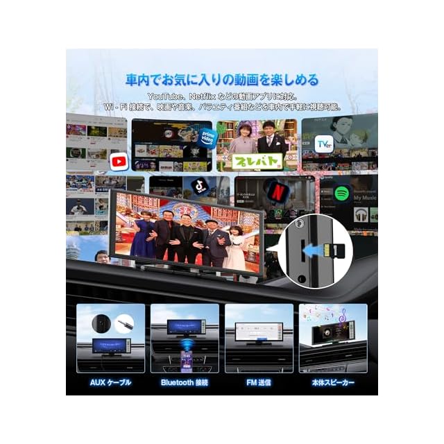 【TFカード対応&3種類の音声出力で自由な視聴体験】 ストリーミングだけでなく、TF(MicroSD)カードに最大256GBまで対応。旅行前にお気に入りの動画や音楽を保存しておけば、通信料ゼロで長距離ドライブも退屈知らず。車載スピーカーへの音声出力は「Bluetooth」「FMトランスミッター」「AUX接続」の3方式に対応しており、好みに応じて高音質の音楽体験が楽しめます。さらに、1:1の分割画面機能で、ナビと音楽アプリなどを同時に表示可能。安全運転を妨げず、ワンタッチで操作できる利便性も魅力です。